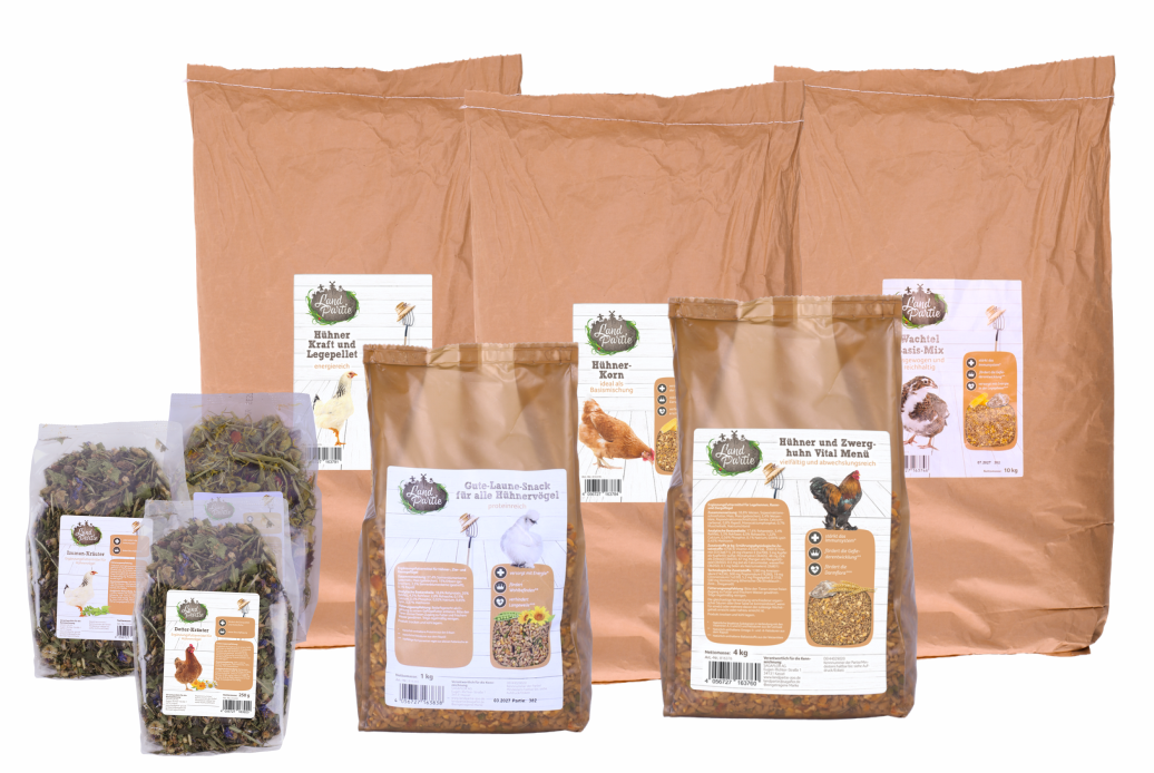 Entdeckt die wachsende Auswahl an Futtermitteln und Ergänzungsnahrung für Hühner, Zwerghühner oder Wachteln von LandPartie.