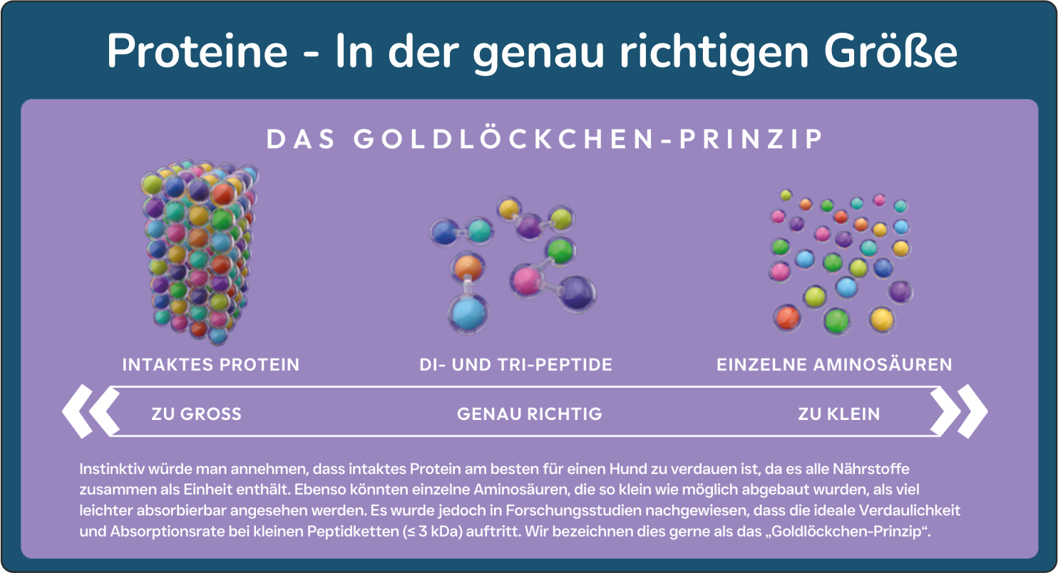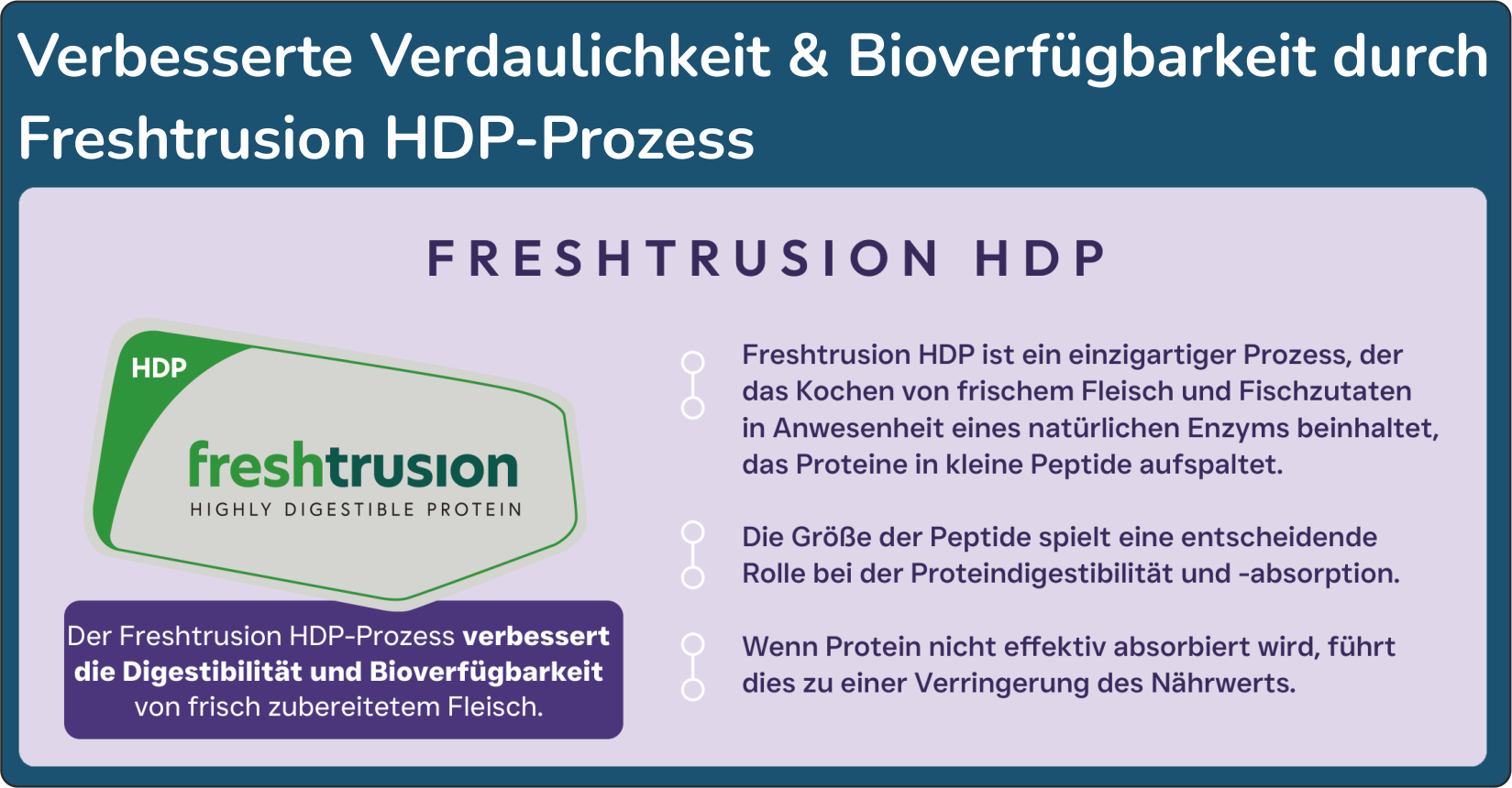 Bei der Herstellung von diesem Spezial-Trockenfutter werden die tierischen Proteine durch den sogenannten Freshtrusion HDP-Prozess enzymatisch gespalten. Dadurch werden die Proteine in die genau richtige Peptid-Größe umgewandelt, was zu einer verbesserten Verdaulichkeit und erhöhten Bioverfügbarkeit der Nährstoffe führt. Die Art der tierischen Proteine werden zudem bewusst ausgewählt, um die Verträglichkeit und das Bedürfnis optimal zu unterstützen - z.B. Weißfisch bei der Sorte zur Gewichtskontrolle. Die Rezepturen von Ben's Diner Care+ sind natürlich auch getreidefrei.